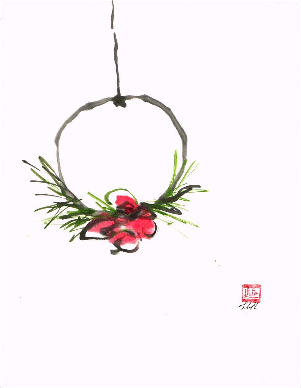 Sumi-e painting of a Christmas wreath decoration. Ink and watercolor on rice paper. mounted on acid-free matting board.